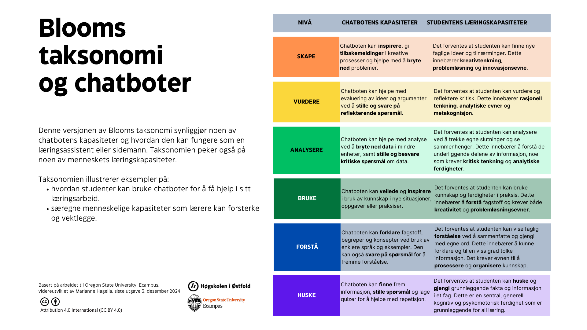 Plakat med oversikt over hvordan chatboter kan bidra i læringsarbeidet i henhold til Blooms taksonomi, også en utdypende forklaring til selve taksonomien.